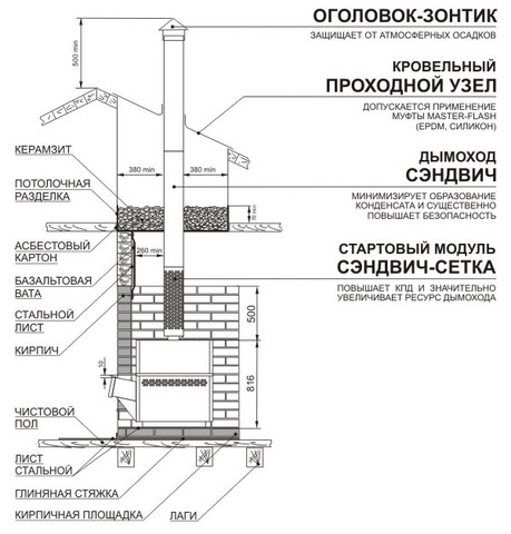 Причиной возникновения пожара в бане зачастую становится дымоход. Выгорание дымохода, как правило, происходит на стартовом участке, где ничем не охлаждаемый внутренний контур трубы-“сэндвича” испытывает предельную термическую нагрузку.