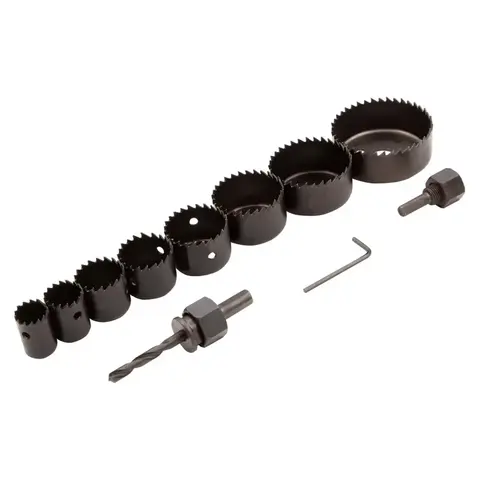 Набор кольцевых пил по дереву, 19-64 мм 11 предм, MATRIX 70473 предназначен для вырезания круглых отверстий диаметром 19-64 мм и глубиной до 27 мм. Входящие в комплект коронки подходят для работы по дереву, фанере, пластику, ламинату, гипсокартону, ДСП. С их помощью можно подготовить поверхность к установке розеток, светильников, выключателей, а также прокладке труб. Коронки устанавливают на электродрели. Для защиты пилы от проворачивания в комплекте предусмотрена специальная проставка. Набор пригодится во время ремонта и будет полезен в быту.