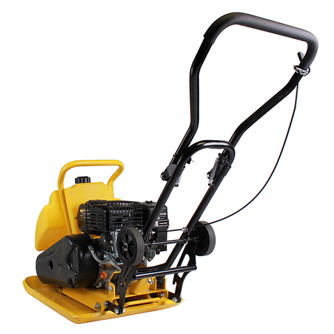 Виброплита оснащена экономичным малошумным 4-тактным двигателем мощностью 6,5 л.с. Развивает производительность до 960 м²/ч и обеспечивает глубину уплотнения до 35 см. Для облегчения перемещения снабжена откидными транспортировочными колёсами и удобными рукоятками. Для слива отработанного моторного масла из картера двигателя предусмотрен специальный шланг.