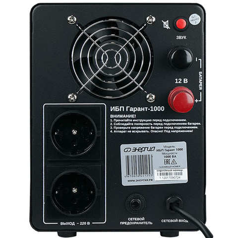 Энергия Гарант 1000 – интерактивный источник бесперебойного питания, обеспечивающий на выходе 220 В с погрешностью 10% от сети и 3% в режиме инвертора при диапазоне входных напряжений от 155 до 275 В.