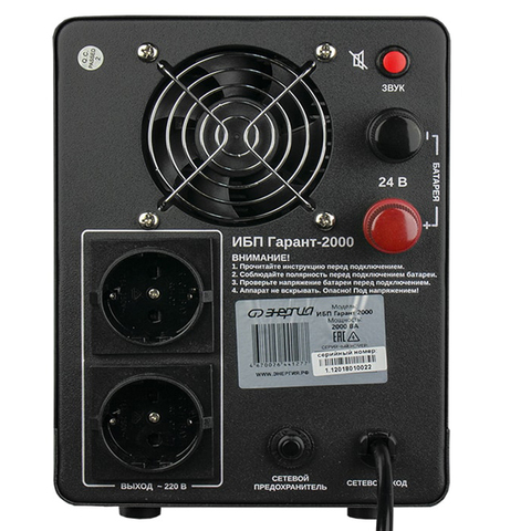 Энергия Гарант 2000 – интерактивный источник бесперебойного питания, обеспечивающий на выходе 220 В с погрешностью 10% от сети и 3% в режиме инвертора при диапазоне входных напряжений от 155 до 275 В.