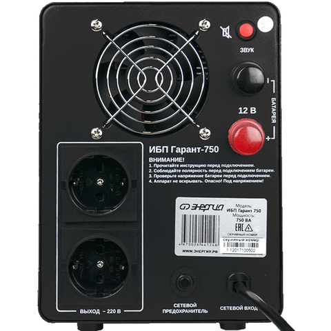 Энергия Гарант 750 – интерактивный источник бесперебойного питания, обеспечивающий на выходе 220 В с погрешностью 10% от сети и 3% в режиме инвертора при диапазоне входных напряжений от 155 до 275 В.