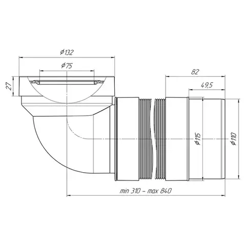 Гофра АНИ пласт K722R применяется для подключения унитаза к системе канализации. Сливная гофра изготовлена из пластика и резины, угол подключения 90°, может растягиваться от 310 до 840 мм, жесткий выпуск.