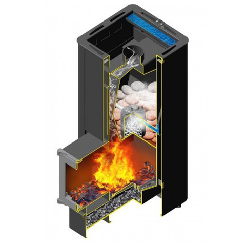 Глубокая емкая каменка печи является мощным парогенератором. Большое количество качественно нагретых камней, обеспечивает стабильность температуры в парилке. Печь оснащена выносным топливным каналом, что позволяет топить печь из смежного помещения. Длинная колосниковая решетка из массивного литейного чугуна, обеспечивает равномерное и мощное горение дров, столь необходимое для банной печи.