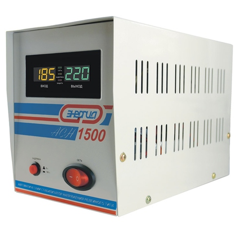 - Полная мощность 1500 ВА. Энергия АСН-1500 – это стабилизатор под небольшую нагрузку, ее величина не должна превышать 1000 Вт. Данная модель – отличный вариант для тех, кто ищет стабилизатор для холодильника, котла или компьютера. Однако при выборе стабилизатора нужно отталкиваться от конкретных данных по нагрузке. Посчитайте суммарную мощность потребителей, под которые берется аппарат, с учетом пускового коэффициента. Если полученное число укладывается в обозначенный лимит, прибор вам подходит.