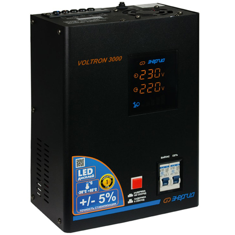 Релейный стабилизатор «Энергия Voltron 3000 (HP)» подходит под электросети, имеющие крайне нестабильное напряжение, и совместим с оборудованием сравнительно невысокой (до 2100 Вт) мощности. Он рассчитан на функционирование при входном вольтаже от 95 до 280 В. Если напряжение выходит за этот диапазон, срабатывает защитное отключение нагрузки. Рабочие границы (в которых обеспечивается погрешность стабилизации до 5 %) составляют 105–265 В. Изменяемая (6 или 180 с.) задержка включения позволяет использоваться стабилизатор для разных типов оборудования, включая чувствительное к частым пускам. Другие его плюсы: устойчивость к холоду (до -30 °С), простота в обращении, полнофункциональный цветной LED-дисплей для отображения важных параметров.