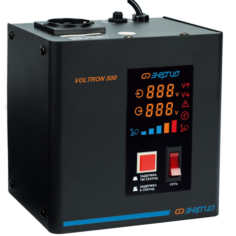 Релейный стабилизатор «Энергия Voltron 500 (HP)» подходит под электросети, имеющие крайне нестабильное напряжение, и совместим с оборудованием сравнительно невысокой (до 350 Вт) мощности. Он рассчитан на функционирование при входном вольтаже от 95 до 280 В. Если напряжение выходит за этот диапазон, срабатывает защитное отключение нагрузки. Рабочие границы (в которых обеспечивается погрешность стабилизации до 5 %) составляют 105–265 В. Изменяемая (6 или 180 с.) задержка включения позволяет использоваться стабилизатор для разных типов оборудования, включая чувствительное к частым пускам. Другие его плюсы: устойчивость к холоду (до -30 °С), простота в обращении, полнофункциональный цветной LED-дисплей для отображения важных параметров.
